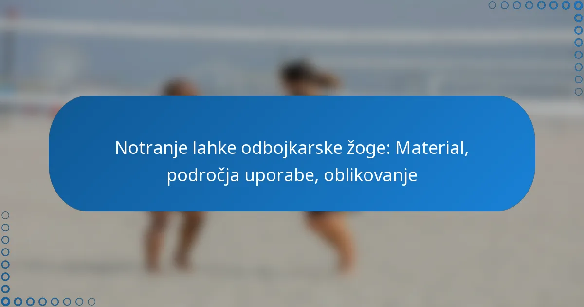 Notranje lahke odbojkarske žoge so predvsem izdelane iz sintetičnih materialov, kot sta poliuretan in PVC, ter nekaterih naravnih možnosti, kot je usnje. Izbira materiala pomembno vpliva na zmogljivost žoge, trajnost in primernost za različne ravni znanja.